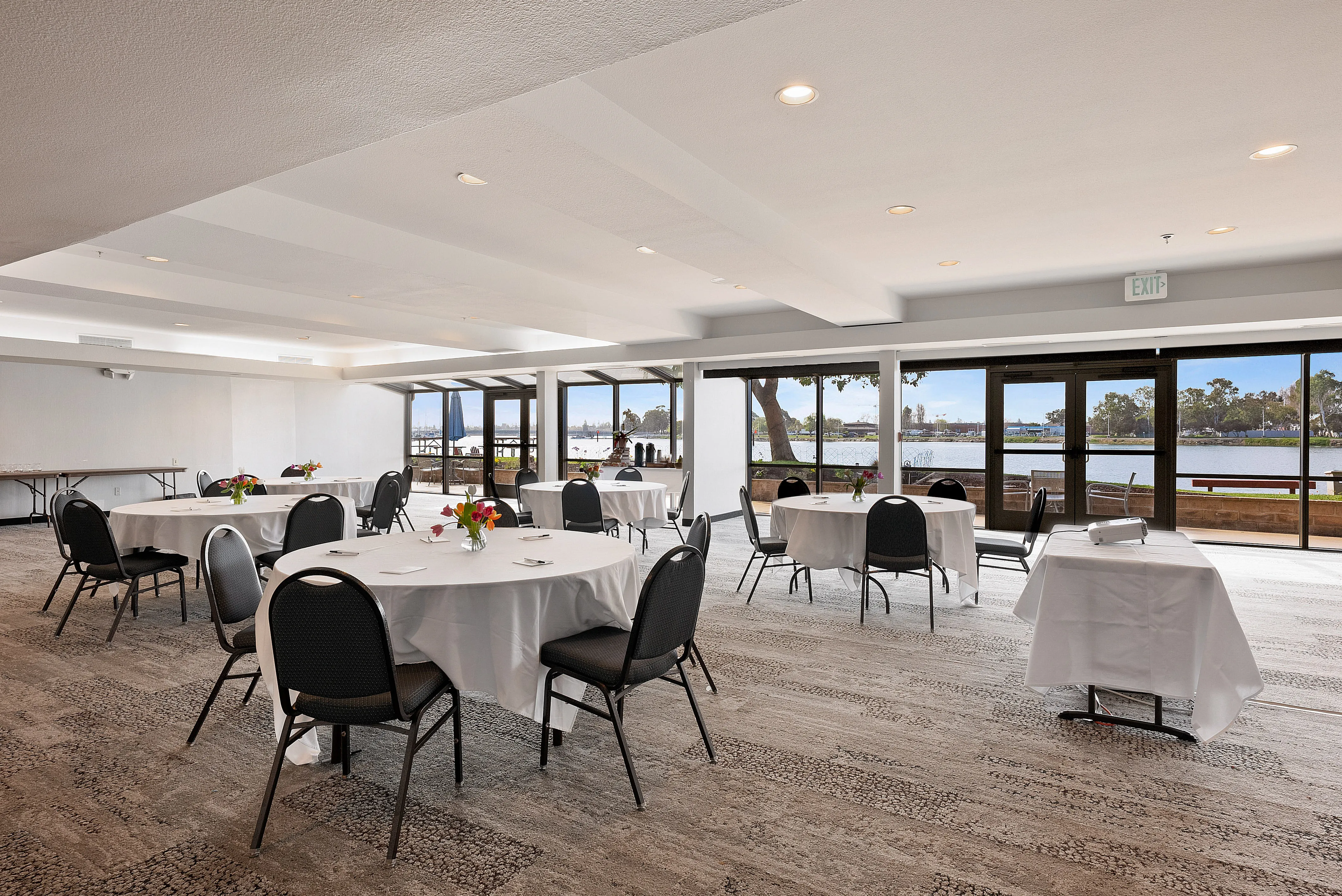 his is a perfect room for a meeting of up to 50 people, banquet style. Number changes a bit depending on audio/visual. This beautiful meeting space has a wall of windows, looking onto the Embarcadero Estuary and has doors that open outside, perfect for a little break from a meeting. Great room for theatre set-up and classroom style.